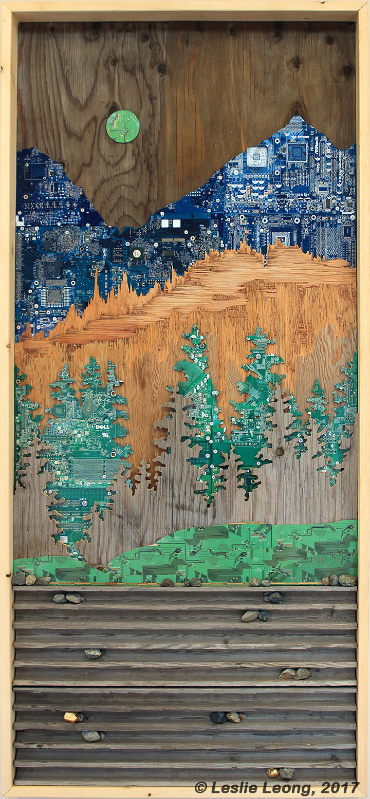 Landscape of Memory: Original Mixed media artwork using recycled computer boards and reclaimed wood by Leslie Leong, Canadian artist, living and working in Whitehorse, Yukon.