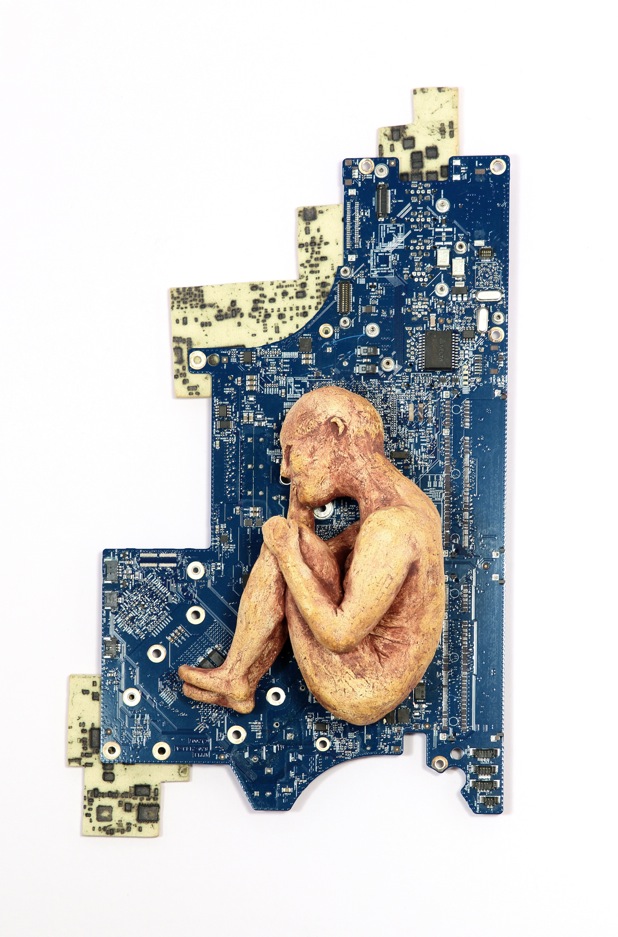 “Lucid Dreaming” ceramic sculpture mixed with recycled computer board handmade by Leslie Leong, Canadian Artist, Whitehorse, Yukon.